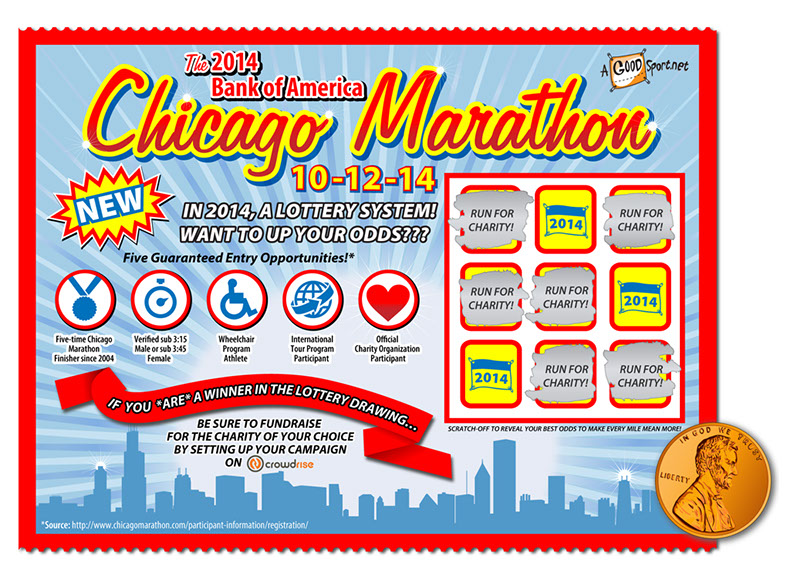 Flyer in the style of a lottery ticket, announcing the new system for the Chicago Marathon.